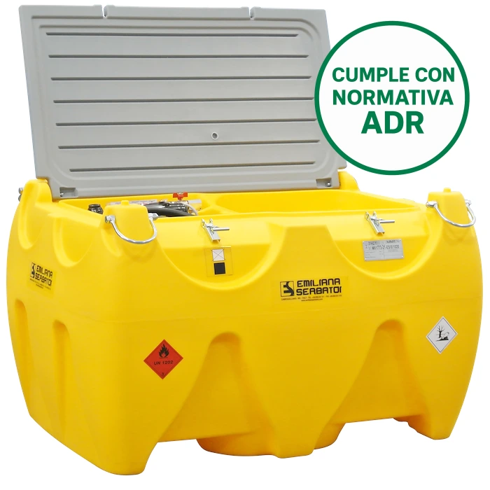 El depósito permite su uso en transporte por carretera, vías navegables, marítimo y ferroviario. Cada unidad ha superado con éxito pruebas de caída, presión hidráulica y neumática, vibración y elevación a plena carga, confirmando su fiabilidad incluso en las condiciones más exigentes. Su diseño reforzado incorpora tapa con cierre por candado, tapón de carga ventilado en aluminio, y puntos de elevación inferiores para horquillas o grúas, permitiendo un manejo seguro y eficiente.